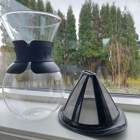 Bodum Pour Over kaffetrakter i glass med rød silikonring og sil. Designet for manuell brygging av kaffe. Passer til hjemmebruk og gir kontroll over bryggeprosessen.