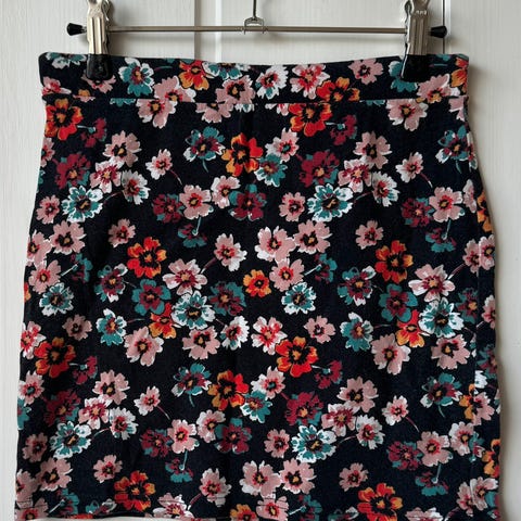 Nelly flerfarget skjørt i størrelse 36 for kvinner. Skjørtet har et blomstermønster og en volangdetalj nederst.