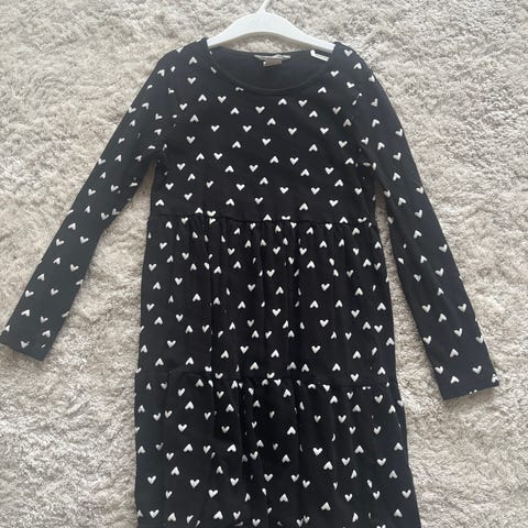H&M svart kjole for barn i størrelse 122, designet for jenter. Kjolen har lag med tyllstoff som gir et voluminøst uttrykk. Materialet består av flere lag som gir tekstur og bevegelse. Passer til formelle anledninger eller festbruk.