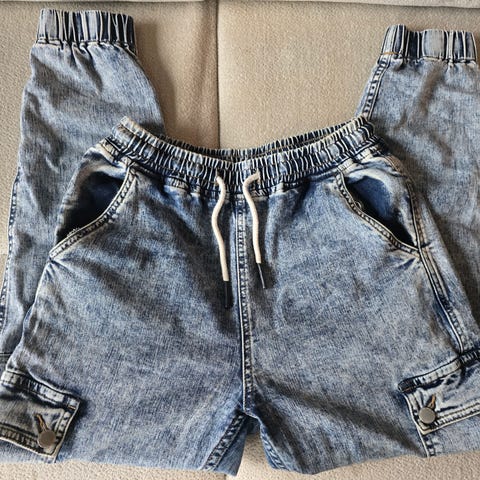 - Grå Jeans bukse i størrelse 38. Fin med glidelås på hver side nederst ved bena .