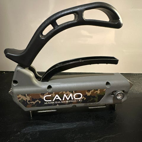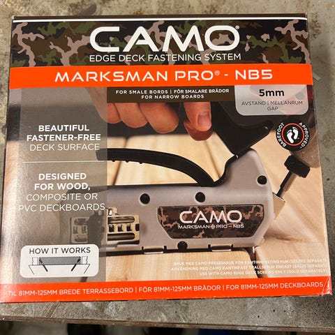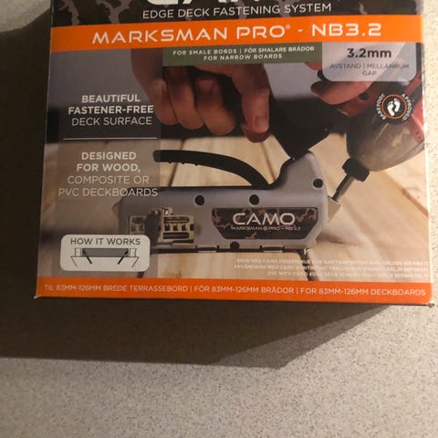 Skrumal CAMO Marksman-systemet er utviklet for effektiv og skjult montering av terrassebord, og er et populært valg blant både profesjonelle og gjør-det-selv-byggere. Med den patenterte CAMO freseskruen oppnår du en overflate uten synlige skruer, fliser eller sprekker, noe som gir terrassen et rent og varig uttrykk. Systemet krever ingen forboring, og skruene kan enkelt fjernes hvis du trenger å bytte et bord, noe som gjør både montering og vedlikehold enklere. CAMO Marksman PRO-NB passer terrassebord med bredde mellom 83 og 127 mm og gir en fast avstand på 3,2 mm mellom bordene for god ventilasjon og drenering. Ønsker du annen avstand, finnes avstandsklosser på 1,6 mm og 5,0 mm som tilbehør.