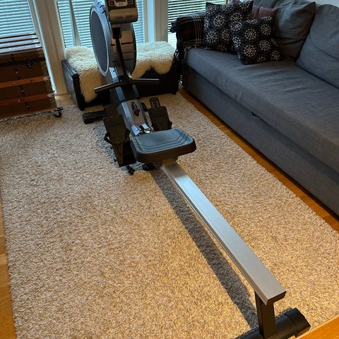 «Kayoba Romaskin Treningsapparat med digital skjerm som viser treningsdata. Utstyrt med justerbar motstand for tilpasset trening. Sete og fotstøtter med stropper for stabilitet under bruk. Egnet for hjemmetrening»