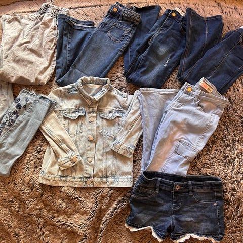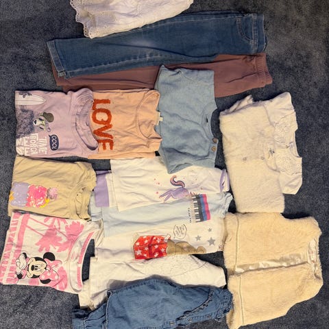 Klespakke med denim og kaninmønstre, 9 deler, str 128. Ny pris!