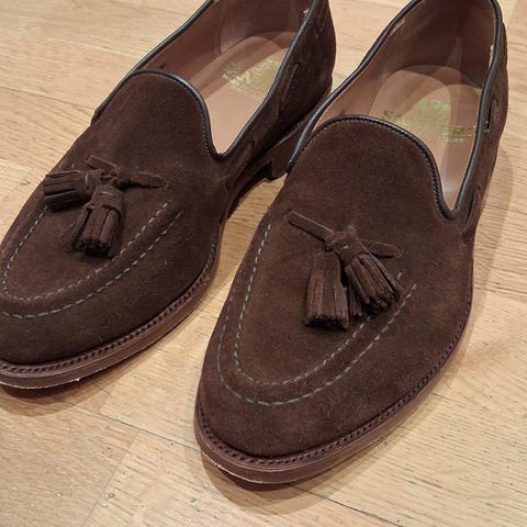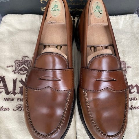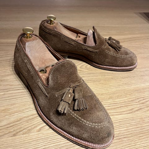 Selger et par med Alden Penny Loafers i mørkebrunt semsket skinn. Modellen heter Dark Brown Suede 9697F - med flex leather sole og Copley last.