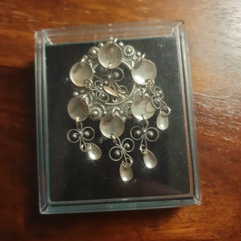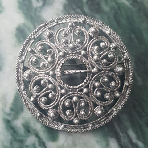 brosje sølje. Laget i sølv med en tradisjonell design. Passer som tilbehør til ulike antrekk- festdrakt, bluse, sjal eller jakke- begge kjønn.