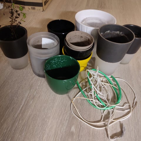 Sett med plantepotter. Pottene har varierende størrelser og farger, egnet for innendørs bruk på balkong eller i hjemmet. Kan brukes til dyrking av små planter eller blomster.
