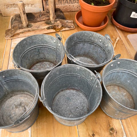 Nydelig sett kjøpt på Kremmerhuset. Har blitt brukt ute i hagestua, så noen få bruksmerker er å se, spesielt på den store krukka (se bilde). Settet kostet samla ca kr 2000. Selger det nå samlet for kr 950,-