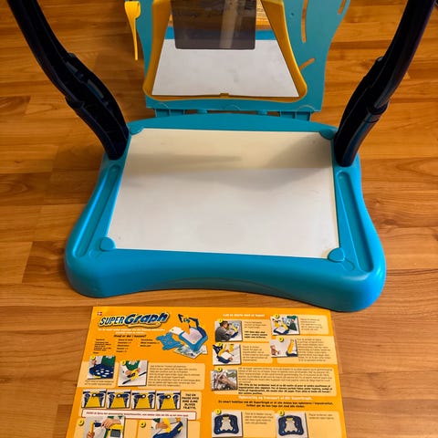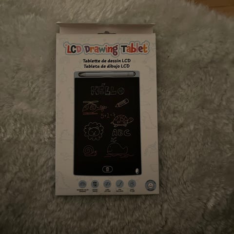 Er mange forskjellige farger ettersom hvor på brettet du tegner. Og knapp for sletting men har lås på bakside som kan settes på og da kan du ikke slette. Inkludert batteri og er penn inkludert i holder på siden.