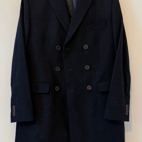 Dressmann kåpe i svart farge for herre, størrelse 48. Yttermateriale består av 65% ull og 35% polyester, med for i 100% polyester. Kåpen har dobbelspent knappelukking og lommer foran. Passer til bruk som ytterplagg i kaldere vær.