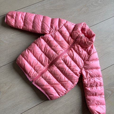 Cubus Rosa jakke i størrelse 140 for jente. Jakken er lett og har en polstret, quiltet design. Den har glidelås foran og hette. Noen små flekker er synlige på overflaten.