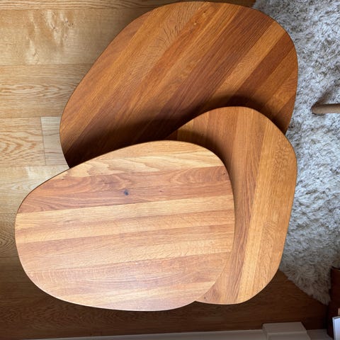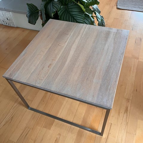To stilrene og pene salongbord i hvitpigmentert oljet eik med ben av rustfritt stål. De står veldig fint til hverandre.