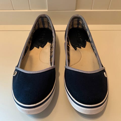 Skoene har farget av på kantenåndet øverst rundt toppen. Enten kan man ta en sprittusj i rød og fargelegge hele kanten - eller få satt på nytt kantebånd. Selges derfor rimelig.