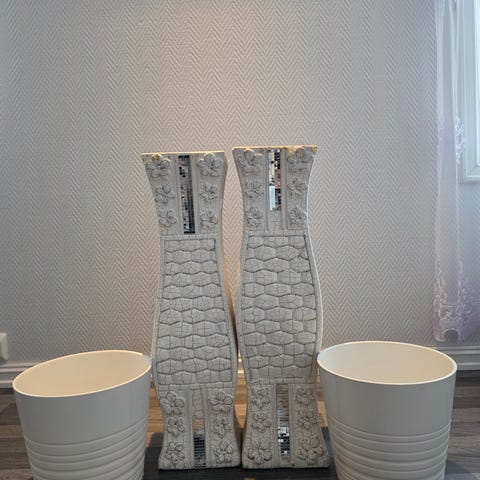 Pen pidestal med tilhørende krukke i keramikk. Selges samlet 300,- for begge.
