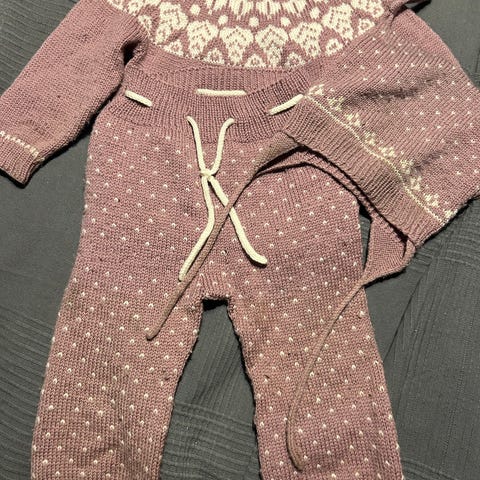 Selger ullsett med jakke/genser fra Janus og hjemmestrikket bukse. Uten noen merknader.