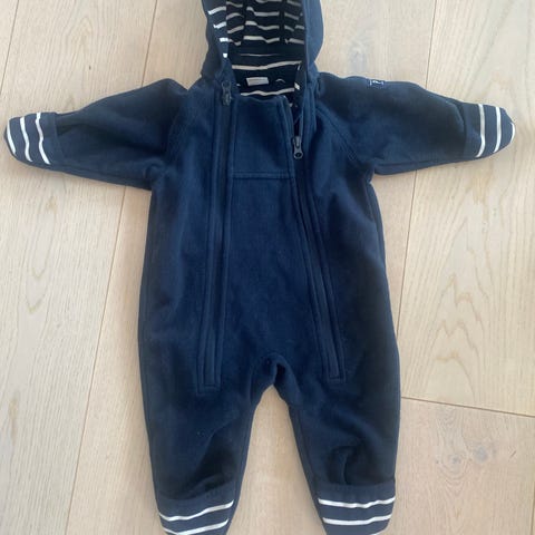 Myk og varm fleeceoverall fra Polarn O. Pyret i marineblå. Praktisk dobbel glidelås for enkel av/på, avtakbar hette (trykknapper), og brettbare kanter på ermer og bein – blir til “votter” og “tøfler” ved behov. Perfekt i vogn/bilstol eller som mellomlag under regn- eller vinddress.