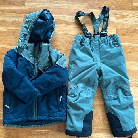 Selger et pent brukt vintersett fra Molo med blå vinterjakke og sort vinterbukse med reflekser fra Molo i størrelse 92.