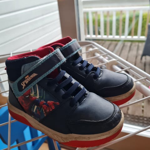 Svarte sneakers til barn med Spiderman motiv, ubrukt. Elastisk såle. Innvendig dimensjon på skoens innleggssåle ca. 15,5 cm.