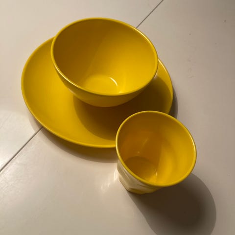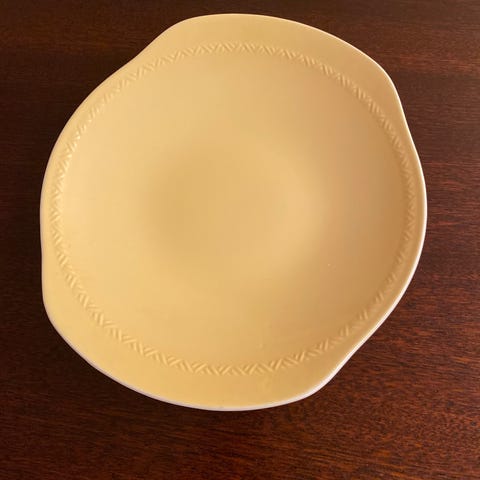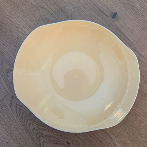 Gul Grete brødfat (26,5 x 24 cm.) ørlite krakelering eller hel og pen og syltetøyskål (dia 11 cm. høyde 7 cm.) litt misfarget i kanten innvendig ellers hel og pen. Ønsker kr. 250,- eller bud samlet. Hentes i Tønsberg eller pakkes godt i bobleplast og sendes for kr. 70,- inkl sporing og forsikring