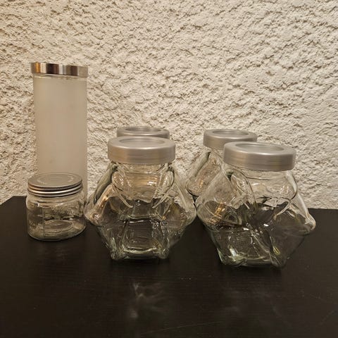 IKEA RAJTAN glasskrukker i 3-pak. Klare glasskrukker med metallokk, egnet for oppbevaring av tørre varer eller andre små gjenstander på kjøkkenet. Har 12 stk uåpnet og 3 som er lite brukt. Selges samlet.