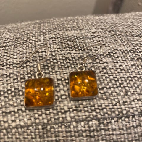 Søte klipsøredobber i sølv og rav.