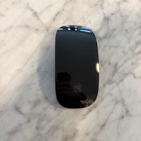 Trådløs mus med oppladbart batteri, designet for bruk med Mac-enheter. Lett og kompakt design med flate berøringsflater for navigasjon og kontroll.