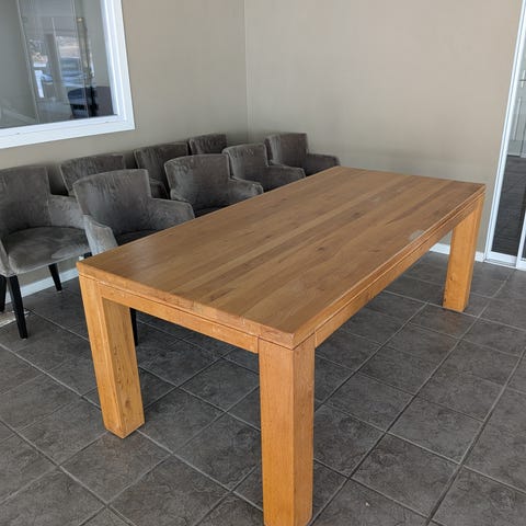 Rustikt spisebord selges. Dette er et "levende" bord med sprekker og forhøyninger her og der. Hvitt understell. Stoler ikke inkludert, og er heller ikke til salgs.
