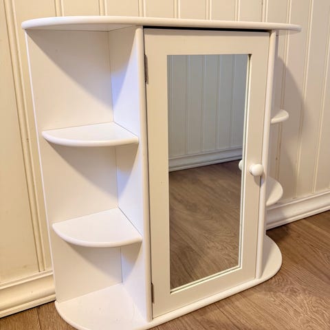 Veggskap med speil. Veggmontert baderomsskap i hvit farge med speil på døren. Skapet har flere åpne hyller på sidene og innvendige hyller bak speildøren, som gir god oppbevaringsplass. Laget av tremateriale med enkel design, egnet for organisering av baderomsartikler.