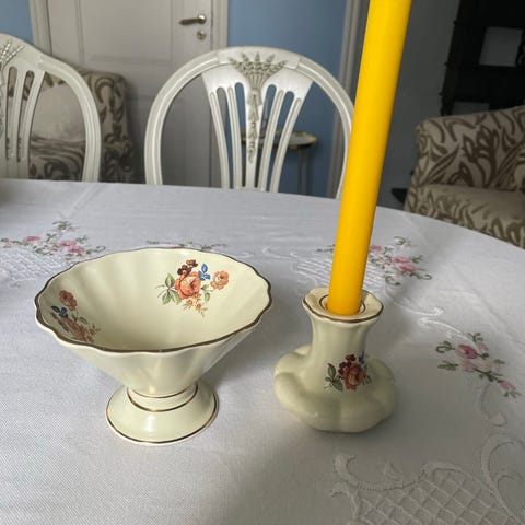 Egersund flint porselensfat med dekorativt motiv av en kvinne i rosa kjole, omgitt av blomster. Fatet har en hvit base med gullfargede detaljer på kantene. Passer som dekorativt servise eller til servering.