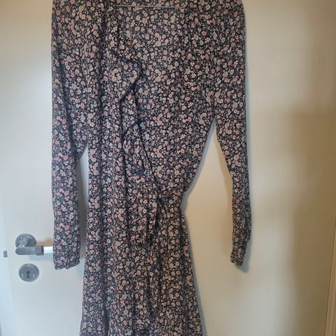 ONLY Sommerkjole i blått med blomsterprint, størrelse 42. Kjolen har lange ermer og et belte i midjen for justerbar passform. Materialet er lett og egnet for sommerbruk.