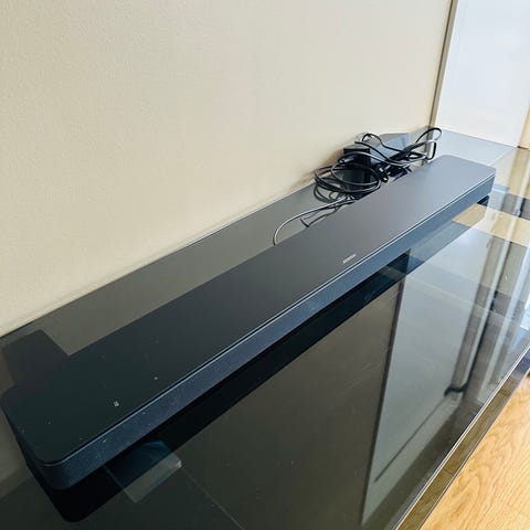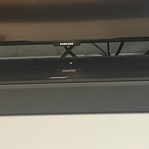 Bose Soundbar lydplanke i svart farge. Designet for å forbedre lydkvaliteten fra TV og andre enheter. Passer for bruk i stue eller andre rom hvor forbedret lydopplevelse ønskes.