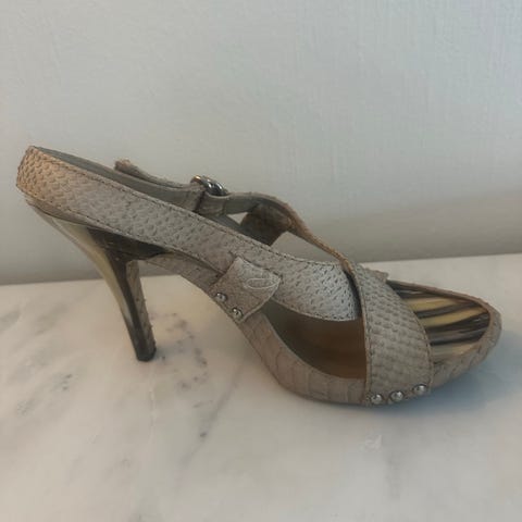 Skikkelig platå sko , i grå farge. Er ikke brukt , da jeg har hatt de til pynt , Har fått en liten skade på materiale . 12 cm høyde på hæl . , sålen foran er 3,5 cm