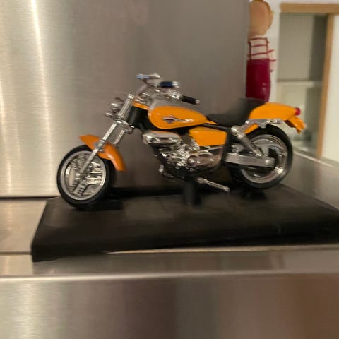 Honda Magna i skala 1:18, produsert av Motormax. Dette er en diecast-modell, som betyr at den er laget av metallstøp. Modellen er oransje med svarte og kromdetaljer, og er montert på en svart sokkel. Slike modeller er populære blant samlere og entusiaster.