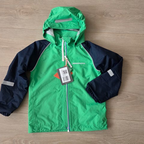 Didriksons barnejakke i størrelse 120 unisex. Jakken har en to-farget design i grønn og mørk blå, med hette og refleksdetaljer på ermet. Materialet er slitesterkt og egnet for utendørs bruk. Den er vann og vindtett.