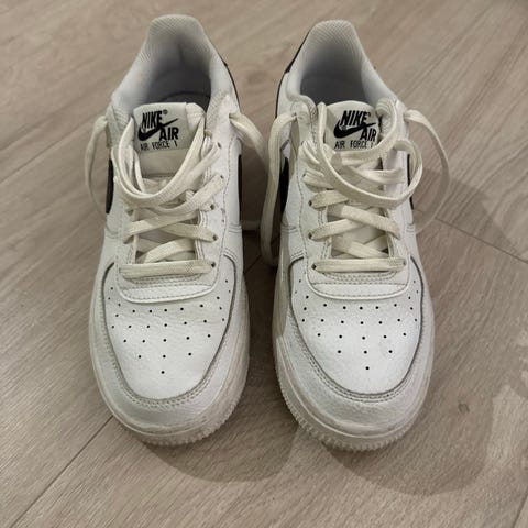 Nike air force 1 i størrelse 35. Skoene er hvite med borrelås og snøring.