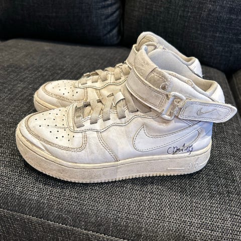 Nike air force 1 i størrelse 35. Skoene er hvite med borrelås og snøring.