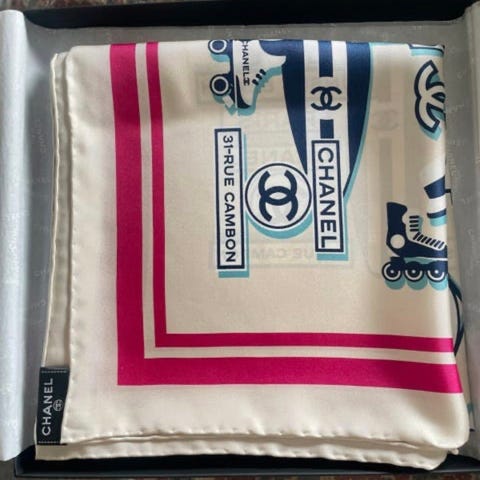 Chanel - SQUARE SCARF, Silk Twill in White & Black