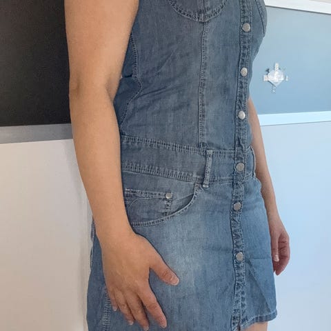 Hverdagskjole i blå jeansfarge, størrelse M. Kjolen har lang erm og myk og god i stoffet. Brukt kun 2 ganger, men passer ikke helt meg. Håper det er noen andre som kan få glede av den.