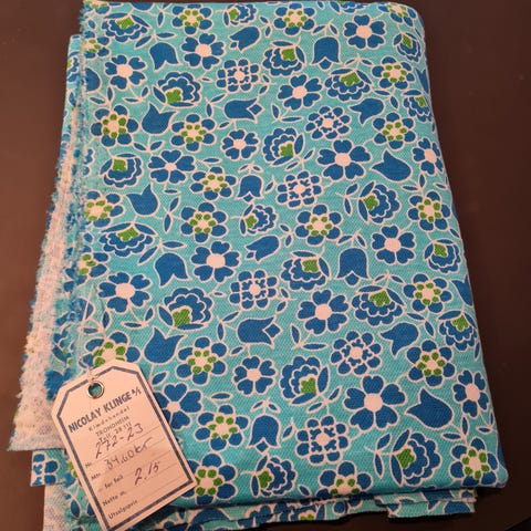 Selger et nydelig, kraftig stoff i polyester, bomull og akryl. Kjøpt på tidlig 2000-tallet. Perfekt til interiørprosjekter, puter, vesker.