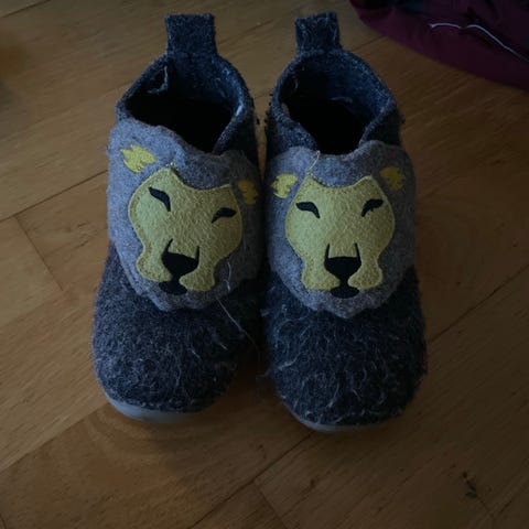 Veldig fine tøfler med god såle under ,strikk over brune løve/tiger tøfler litt liten i str så fikk ikke brukt de , ny pris er 350kr har kun brukt de en gang men de var for liten