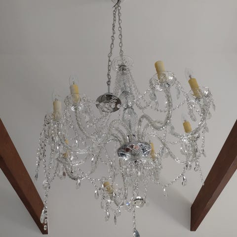 Eldre lysekrone i god stand. 12 av prismene er lyserosa. Mangler ett prisme, var slik da den ble kjøpt. Kan ikke sendes, men kan levere i Oslo-området.