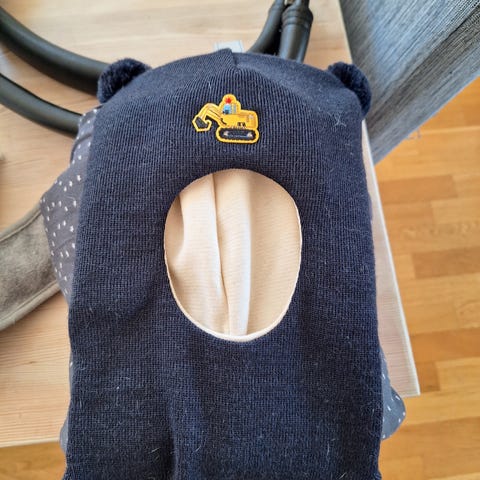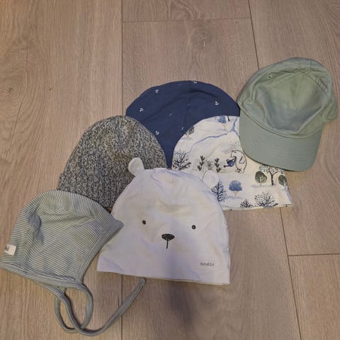 4 pent brukte luer selges samlet. Grå vaskebjørn-lue er fra Lindex og er tynn og ufôret. Grå lue er fra H&M og er fôret. Blå lue er fra Reflex og har fôr. Blå med eikenøtter er fra Lindex og har fôr.