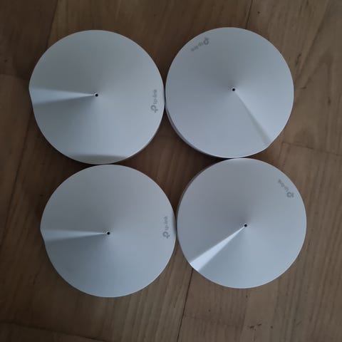 TP-Link Deco Mesh Wi-Fi Router i hvit farge. Enhetene er designet for å gi trådløst nettverk med mesh-teknologi, som forbedrer dekning og stabilitet i hjemmet eller kontoret.