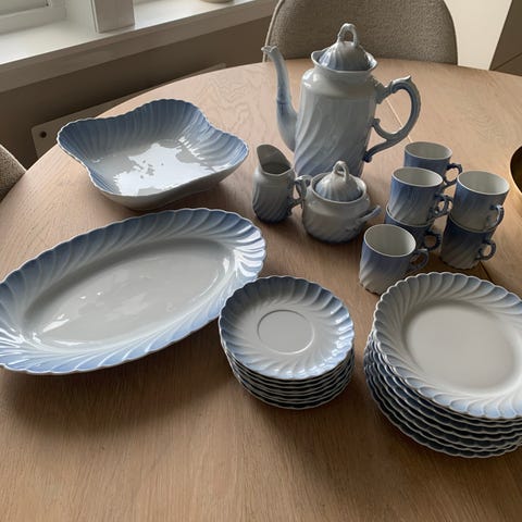 Tallerknene har forskjellige blå blomster. Toppen på lokket til serveringsfat er limt.