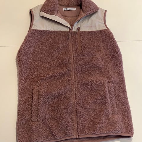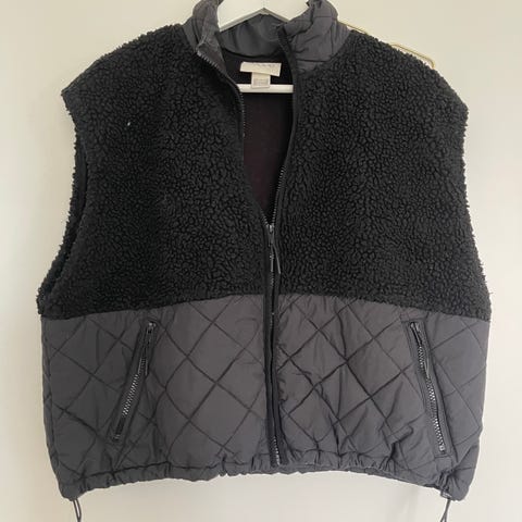 Oversized H&M vest for kvinner i størrelse S. Vesten har en kombinasjon av materialer med myk fleece på øvre del og glatt stoff på nedre del. Fargen er beige. Vesten har glidelås foran og er uten ermer, egnet for utendørs bruk. Kun brukt èn gang.