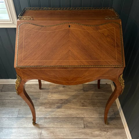 Gammel og brukt skrivepult.Ukjent alder eller produsent.Sannsynligvis fra Asia.Ligner litt bombay møbler???Skriveplaten kan tas ut som på bildene men vanskelig.Noe bruksmerker kan finnes.Kan demonteres for transport i flere deler(ganske tung når montert).Kan hjelpe med levering i område om du trenger det😊
