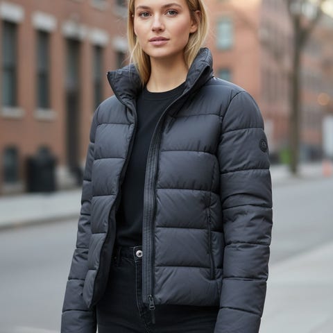 Jakka lukkes med glidelås foran og har to sidelommer.