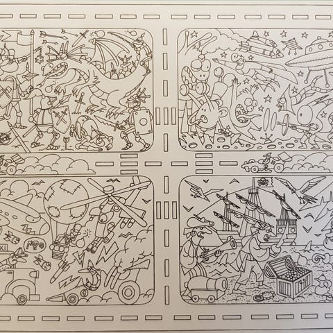 LEKEPLASSEN - stort (120 x 80cm) fargeleggingsark/plakat for å rulle ut på gulvet/veggen/kjøkkenbordet og fargelegge med fargestifter, tusj eller maling. Den har forsterket bakside som forhindrer at maling går igjennom. Laget av tykk papp som man kan rulle frem og tilbake.