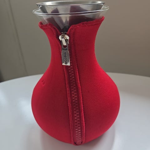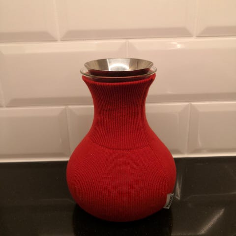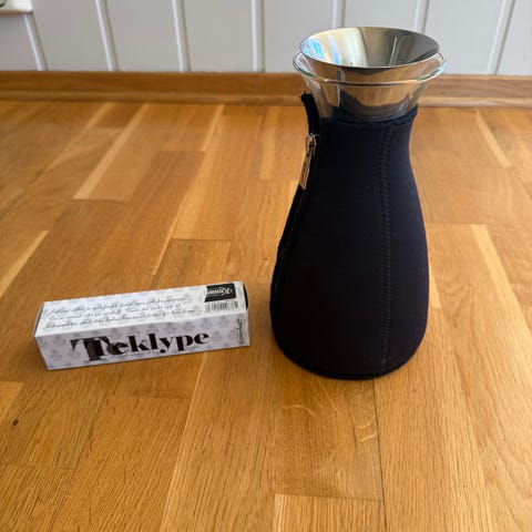 Tebrygger fra Eva Solo. Pent brukt, men med noe spor av bruk. Litt brunfarge etter te nederst i kolben innvendig. Noe dpor av bruk også i silen, men ingen skader Ingen skader i glasset. Alt i alt god stand ig pent brukt . Brunt trekk rundt som holder på varmen/ termosfunksjon