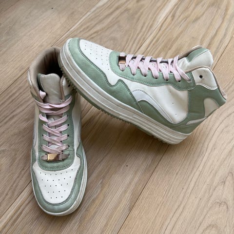 Nike Sneakers joggesko i størrelse 44. Skoene har en hvit farge med grønne detaljer, inkludert snøringer og kant rundt ankelen. Materialet er hovedsakelig skinn. Designet er høyt over ankelen, egnet for både sport og fritidsbruk.