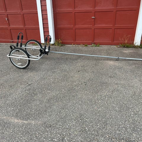 Sykkeltrallen er lett og triller godt. Den henger godt etter sykkelen. Lett å svinge med. Den kan også reguleres i lengden. Kajakken ligger godt og stødig